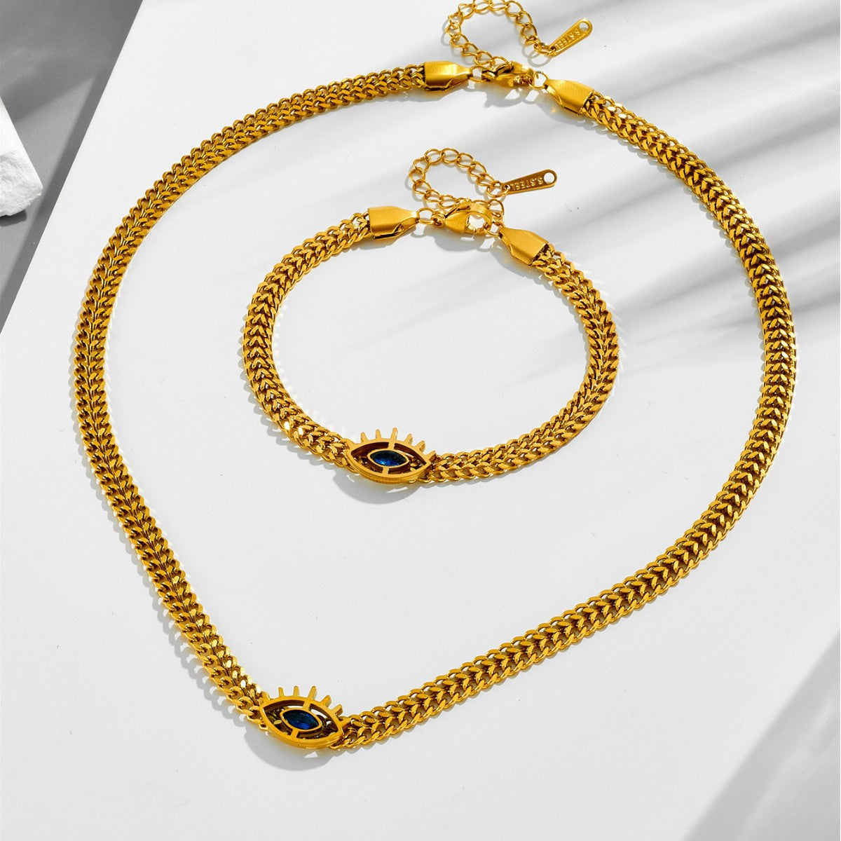 This elegant jewelry set features a gold-plated stainless steel necklace and bracelet, each adorned with a striking evil eye charm. The intricate woven chain design adds a touch of sophistication, while the vibrant blue and gold of the evil eye offer both style and protection.