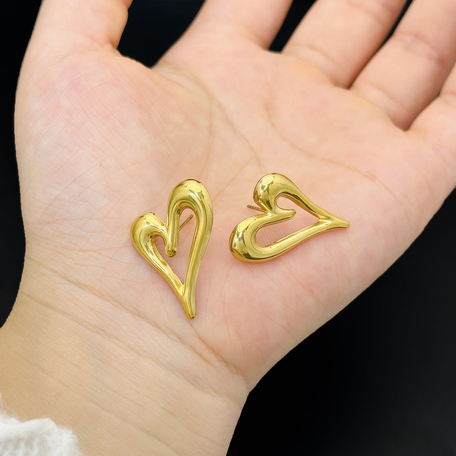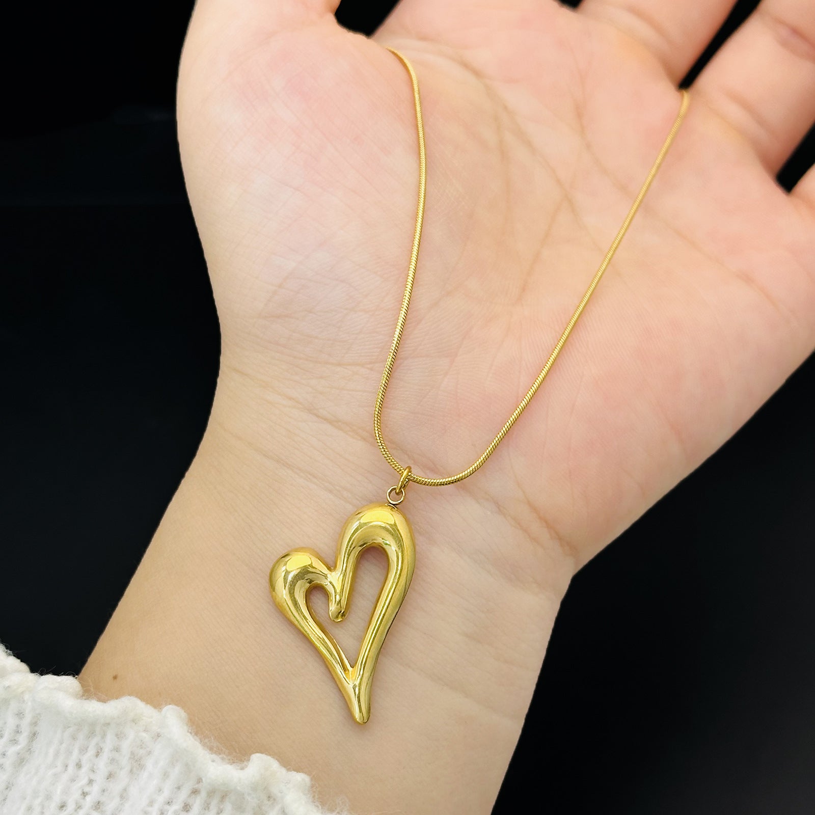 This jewelry set features an 18k gold-plated heart pendant necklace and matching heart-shaped earrings. The necklace has a delicate chain and a solid, stylized heart pendant. The earrings mirror the pendant's design, offering a cohesive and elegant look. This set is suitable for adding a touch of sophistication to both casual and formal outfits, making it a must-have accessory for your collection.