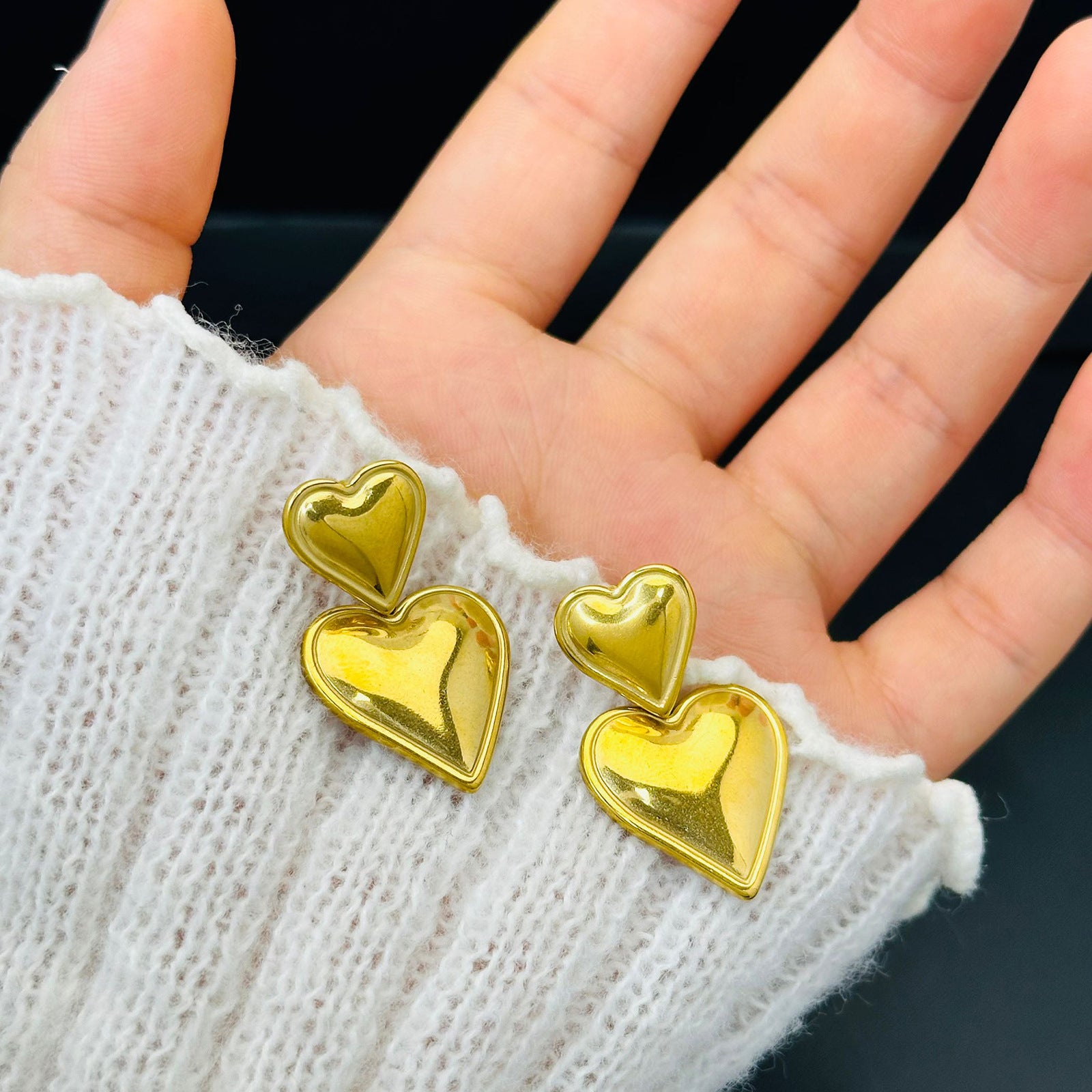 This elegant jewelry set features a heart-shaped pendant necklace and matching stud earrings. The set is crafted from 18k gold plated stainless steel, giving it a luxurious and radiant finish. The necklace showcases a single, smooth heart pendant suspended from a delicate chain, while the earrings present a double-heart design, with a smaller heart perched atop a larger one.
