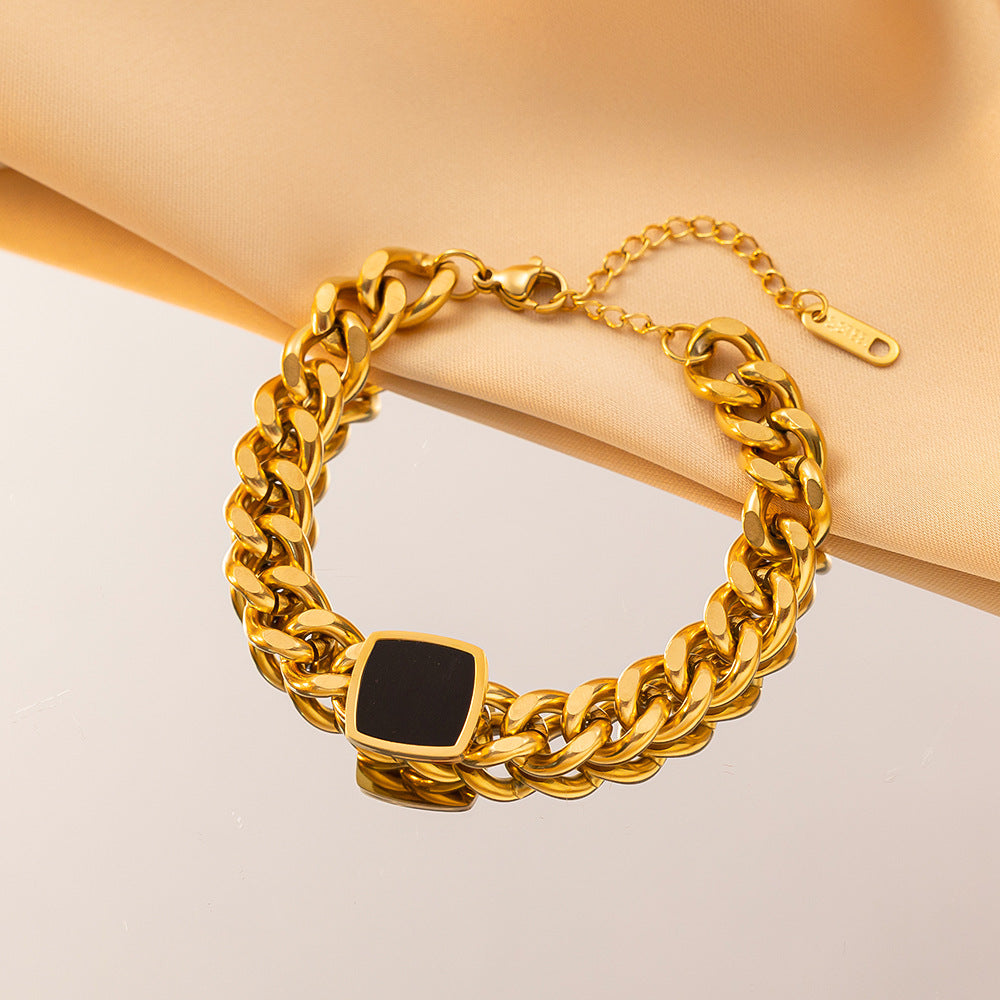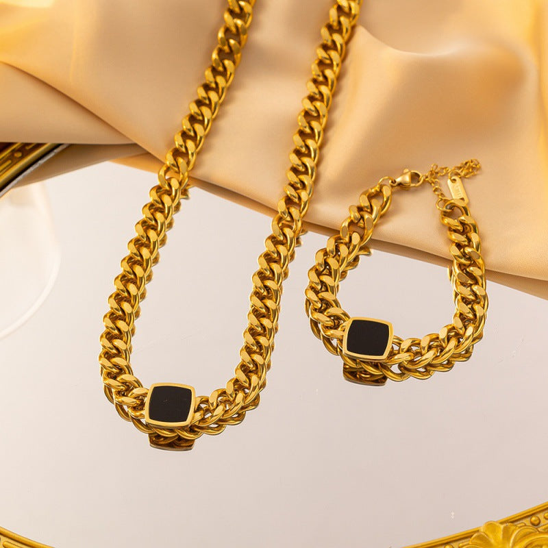 This matching jewelry set features a bold, modern design perfect for adding an edgy touch to any outfit. The set includes a chunky curb chain necklace and a matching bracelet, both crafted from high-quality, gold-toned stainless steel. Each piece is accented with a sleek black square pendant, providing a striking contrast and contemporary feel. This 2021 Trendy Korean-inspired set is designed for those who appreciate minimalist yet statement-making accessories. The robust construction and secure clasps ensure durability and comfortable wear, making it ideal for everyday use. Whether worn together or separately, this necklace and bracelet set is sure to elevate your style.