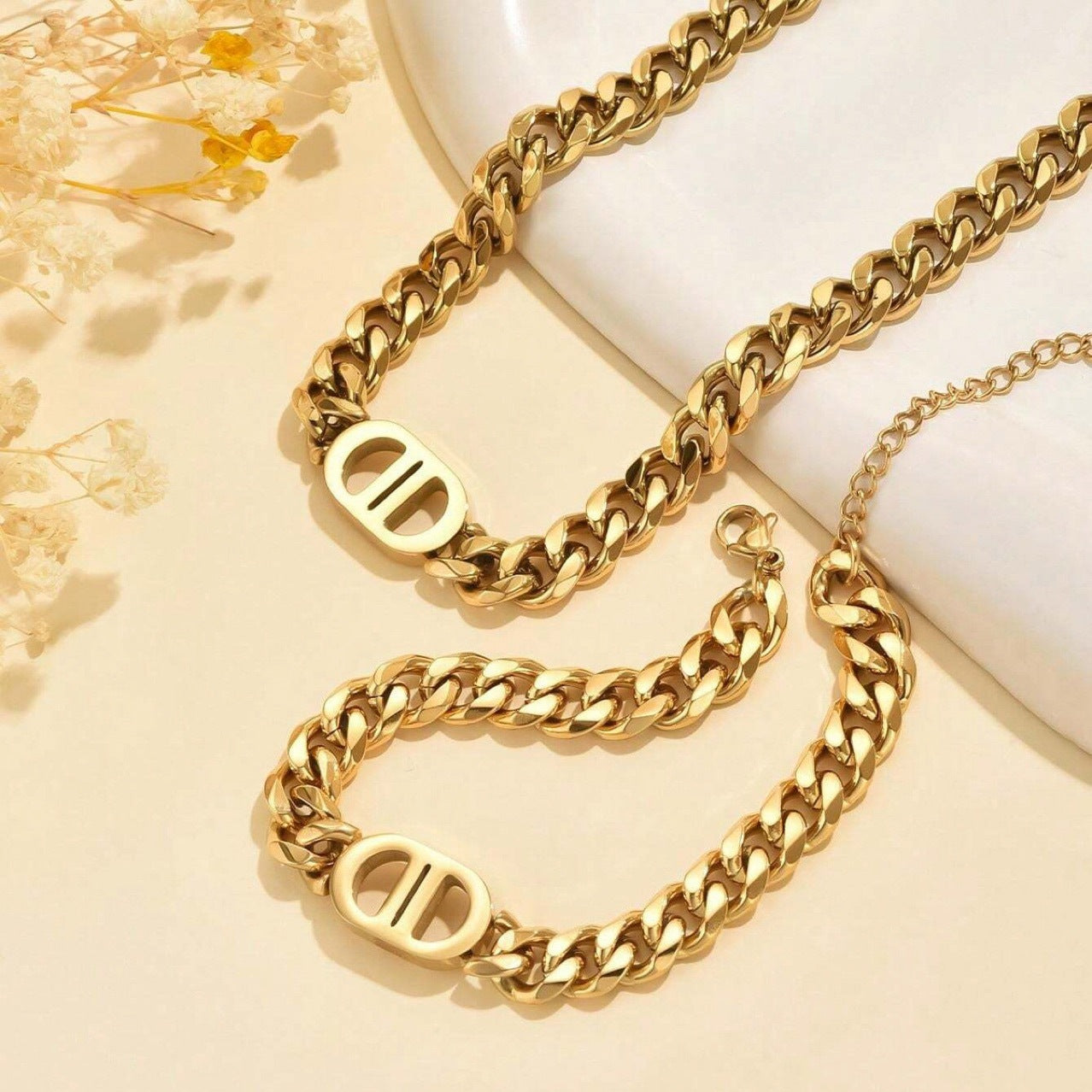 This stylish jewelry set features a gold-toned, double "D" chain design, exuding a modern and chic aesthetic. The set includes a necklace and a matching bracelet, both crafted from durable stainless steel. The necklace showcases a prominent "CD" logo as part of its chain, while the bracelet mirrors this design element for a coordinated look. The chain links are robust and have a substantial feel, suggesting a high-quality construction. This set is perfect for adding a touch of elegance to any outfit, suitable for both casual and more formal occasions.